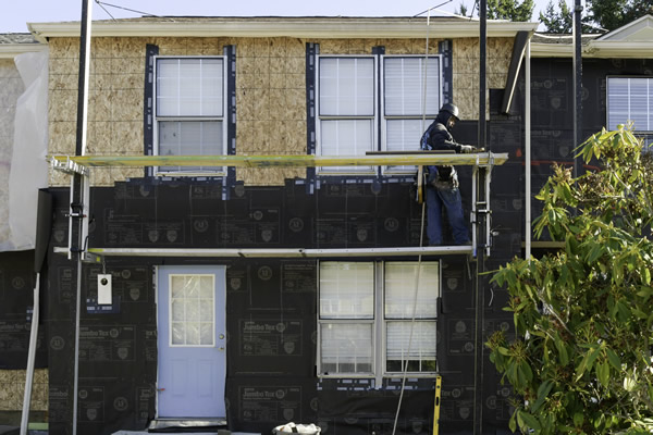 The buildings did not have any wall sheathing beneath the existing siding, so plywood sheathing was added for better structural stability during the new siding installion.